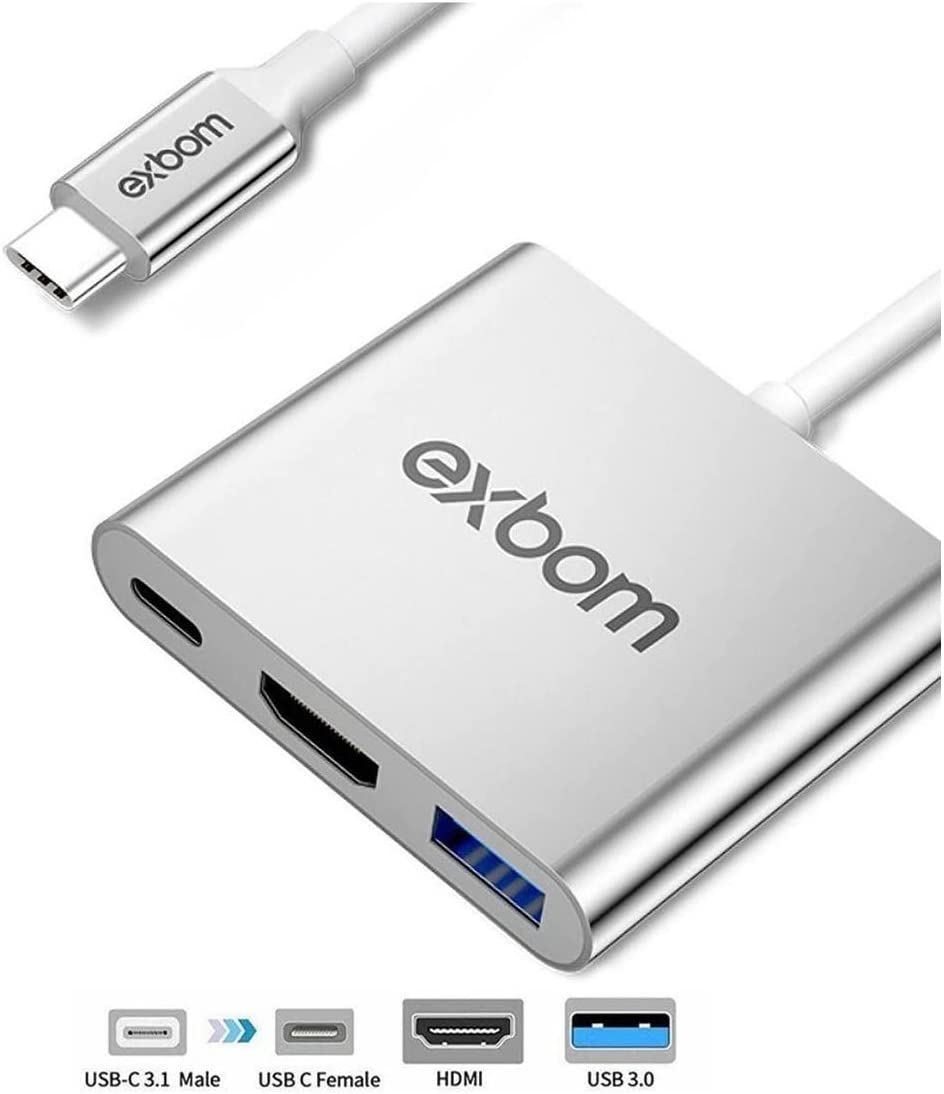 Cabo Adaptador 3 em 1 Conversor USB Tipo-C para HDMI + USB 3.0 + Tipo C Exbom
